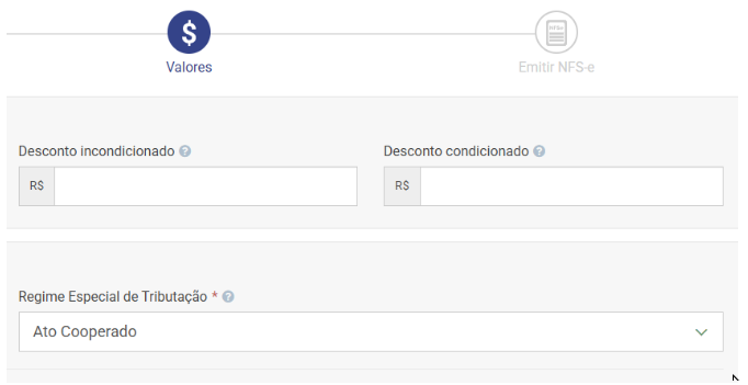Para emissão via Web, deve-se selecionar o referido regime no campo “Regime Especial de Tributação” na tela de Valores, conforme imagem abaixo: